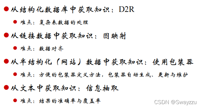 根据知识的来源,有来自于结构化数据,链接数据,半结构化数据,以及文本数据,每一个数据来源,都有对应的关键技术难点,如下图所示