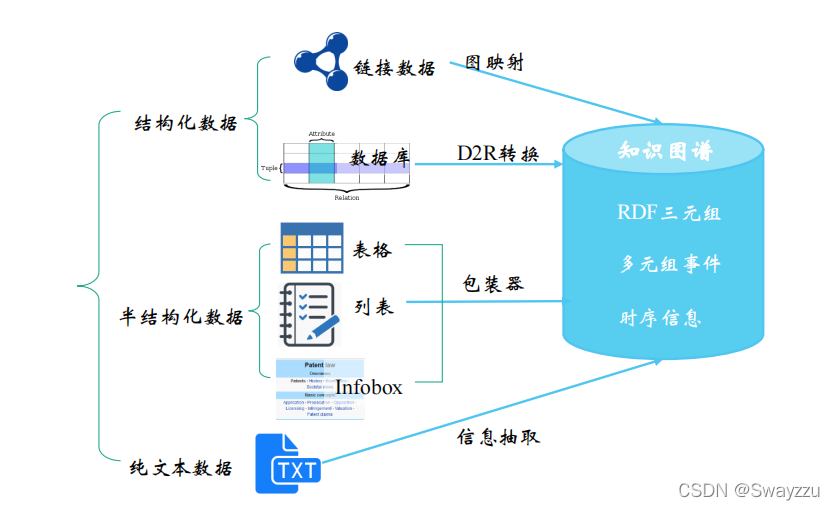 从不同来源,不同结构的数据中,进行知识的提取,并形成知识,存入到知识图谱