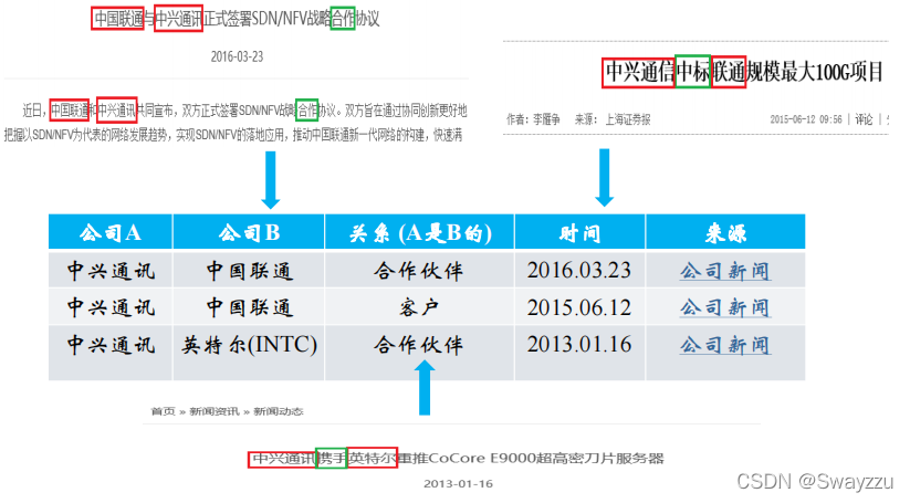 →远程监督方法:比如知识库中存在“创始人(乔布斯,苹果公司)”,那么就可以从非结构化文本中,把包含这两个实体的句子,作为训练样例。