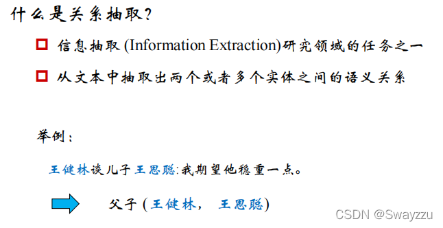 如下图所示,根据一句话,我们可以抽取出实体之间的关系,比如王健林和王思聪是父子关系等。
