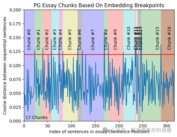 gradient:梯度法,这种方式稍微难理解一些,它首先计算了所有距离的梯度(对于这个场景其实是一阶差分,因为是离散值),梯度计算出来后,就可以知道哪个地方距离变化得快,然后选择所有梯度95分位的位置作为切分点,95是代码中的默认值。这个方法背后对应的道理是,句子之间的距离是有增有降的,那在增加的过程中,如何找准时机呢,那我一定要在猛增的那个点进行切分,其实跟k-means使用肘方法来确定类簇数量,想法是一样的
