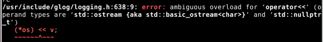 /usr/include/glog/logging.h:638:9: error: ambiguous overload for ?operator<<? (operand types are ?std::ostream {aka std::basic_ostream<char>}? and ?std::nullptr_t?)