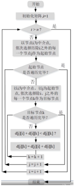 第一次循环:初始化矩阵i=1;判断 i 是否大于 n;否——则以结点i伟中介点,依次选择除i之外的每一个节点j(初始化j = 1)作为起始节点.