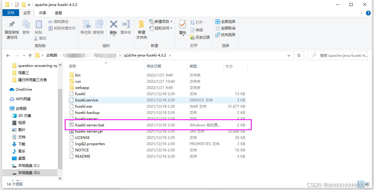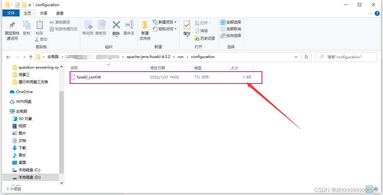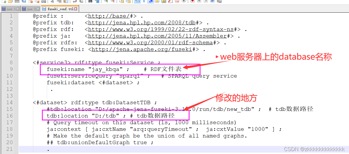 注意:注意对照fuseki_conf.ttl文件中的目录是不是跟本地一样。根据上一步来看,我们的tdb文件是在D:\tdb文件下的,所以这边的配置文件需要修改下