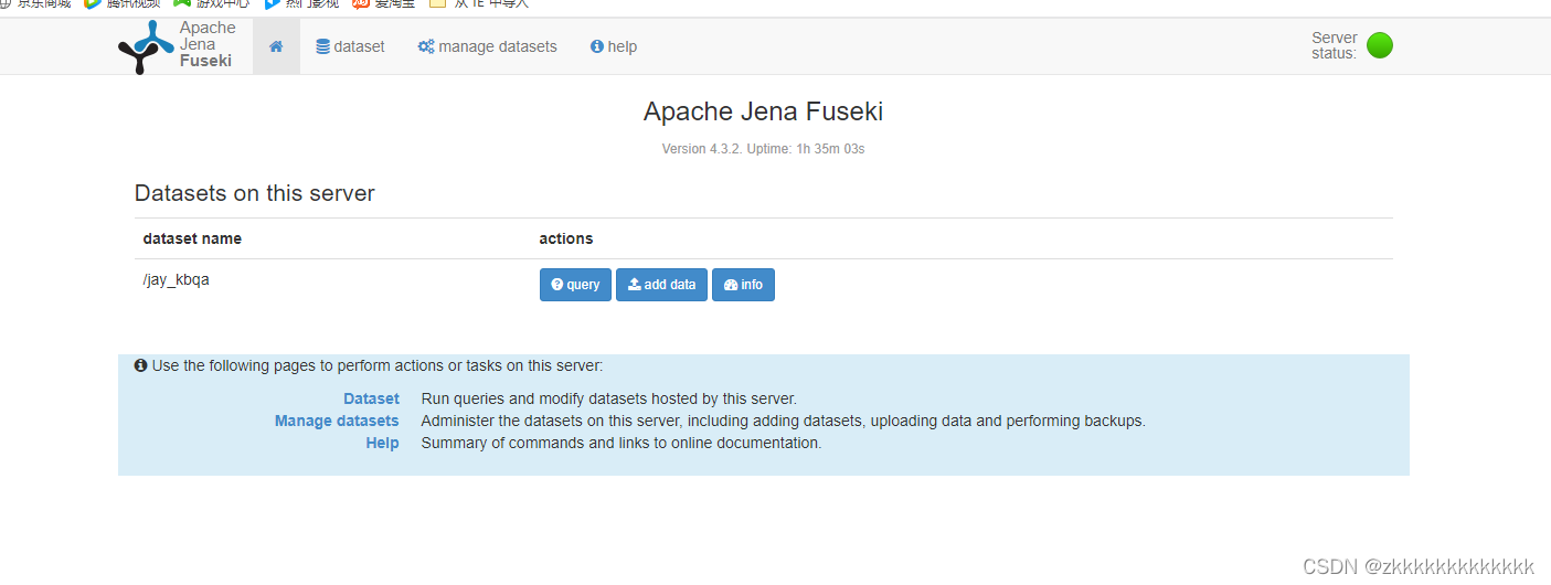 进入apache-jena-fuseki执行fuseki-server.bat,打开localhost:3030后应该可以看到如下页面,此时就可以在平台上SPARQL语句查询。
