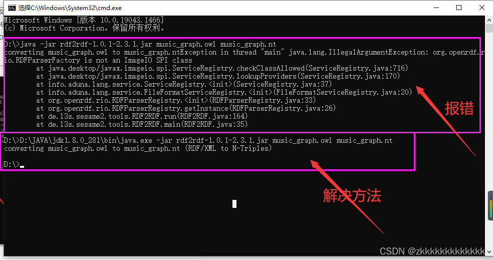 注意:此步骤如果报如下错误则说明jdk版本有问题,切换到1.8就可以了。错误:converting music_graph.owl to music_graph.ntException in thread "main",java.lang.IllegalArgumentException: org.openrdf.rio.RDFParserFactory is not an ImageIO SPI class