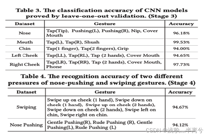 鼻推估计和滑动的识别精度。结果如表 4 所示。他们的⽅法在识别两个鼻翼上的两种不同的推鼻压力⽅⾯达到了 94.12% 的准确率。同时, 6种滑动手势的识别准确率为94.67%总的来说,对于所有手势,通过十个⽤⼾的数据进行验证,FaceSight 实现了83.06% 的整体分类准确率。