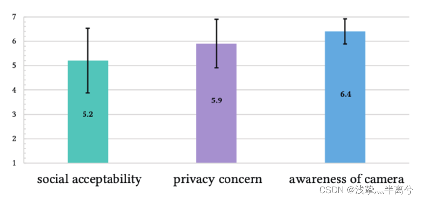 在李克特 7 点量表中,7 表示最积极的感觉,而 1 表示最消极的感觉。关于外形的主观感受。图 10 从三个⽅⾯反映了? FaceSight 增强型摄像头使⽤的主观评价(外形尺⼨的社会可接受性、隐私问题和摄像头意识)。参与者普遍接受了外形尺⼨(平均=5.2 ±1.32) 。他们对隐私问题也保持积极态度(平均值=5.9 ±0.99)。对于摄像头遮挡真实世界视野的问题(平均值=6.4 ±0.52),两名参与者在整个过程中没有注意到摄像头突出,而其他八名参与者则注意到了。尽管如此,他们中的⼤多数人还是觉得,“该设备看起来⾮常透明且不清晰。它只有在专注于它时才能看到。”结果表明,将相机紧凑地安装在 AR 眼镜上是社会可接受的,不会影响⽤⼾体验。