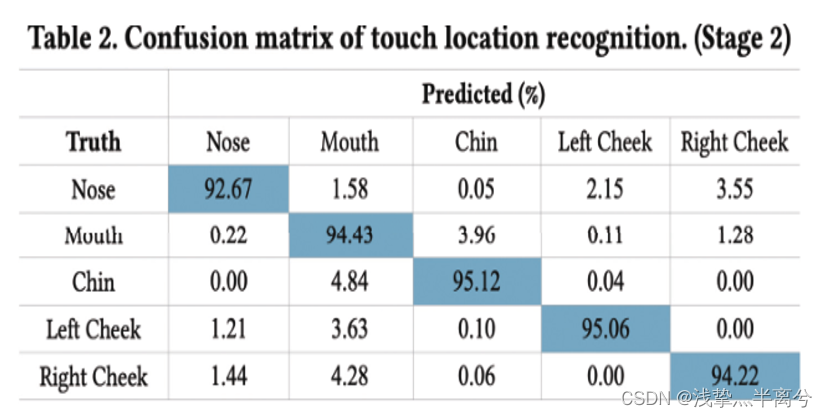 表 2 为触摸位置识别的混淆矩阵。⼤多数错误识别发⽣在: 1)鼻子和脸颊; 2)嘴巴和下巴,尤其是在做嘘声或抓下巴时; 3)嘴和脸颊。