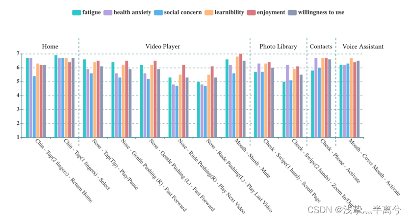 图 9 显示了参与者对手势(疲劳、健康焦虑和社会关注)和互动技巧(易学性、享受性、使⽤意愿)的平均得分。总的来说,参与者对五个示例应⽤程序中的交互技术表示赞赏。他们认为交互技术使⽤起来很有趣且易于学习,尤其是执行“嘘”手势以使应⽤程序静⾳,在每位参与者的“使⽤乐趣”指标中都获得了“7”分。