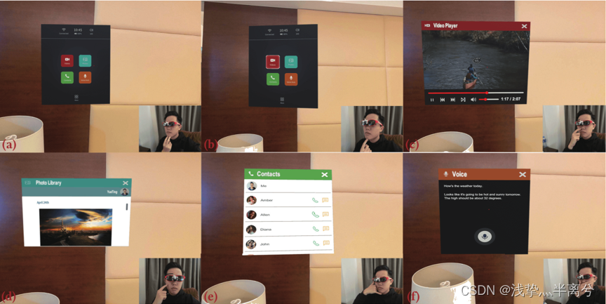 基于论文中提到的手势集,他们设计并开发了五种 AR 应⽤程序和十⼆种交互技术,以展示FaceSight 的潜在⽤途。这五个应⽤程序包括主页、视频播放器、照⽚库、联系人和语⾳助手。