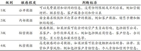 要对数据进行保护之前,首先要确定哪些数据需要保护和为什么要保护这些数据。这其本质是一个数据分级的问题。数据分级从概念上讲是根据数据的敏感程度和数据遭到篡改、破坏、泄露或非法利用后对受害者的影响程度,按照一定的原则和方法进行定义。另一方面也需要关注的就是法规遵从性需求。例如《数据安全法》第二十一条就规定,”国家建立数据分类分级保护制度,根据数据在经济社会发展中的重要程度,以及一旦遭到篡改、破坏、泄露或者非法获取、非法利用,对国家安全、公共利益或者个人、组织合法权益造成的危害程度,对数据实行分类分级保护”。下图就是就是按数据敏感程度做的一个划分示例