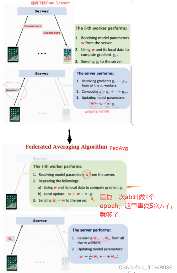 (每次把本地数据扫一遍叫做1个epoch,ab步骤1到5个epoch就好了,重复太多也不好)