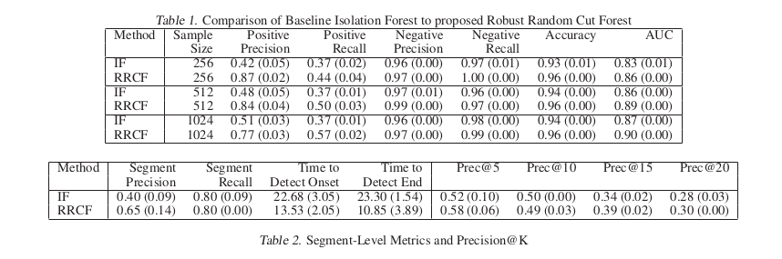 本文采用了一种基于模型的异常定义,它能够捕捉模型添加/删除一个点的差异效果。实验表明,这个算法在对抗报警疲劳和捕捉更多漏报异常方面有很大的前景。RRCF还可以帮助检测流中的变更点,一个变化点是时间t中的一个时刻,在时间t之前,数据分布为d1,在时间t之后,数据分布为d2,并且d1与d2完全不同随着时间的推移,通过维护一个sketch序列,可以比较两个sketch,以确定分布是否发生了变化(Delete操作)。