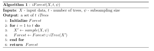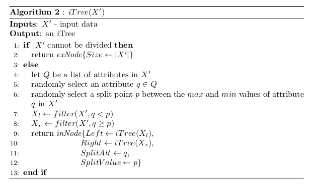 上图为孤立森林的建树方法,孤立森林算法使用了与RRCF相似的方法,但是修改了要切割的维度为均匀随机选择的。孤立森林的优点是不同的维数是独立处理的,并且算法对不同维数的缩放是不变的。