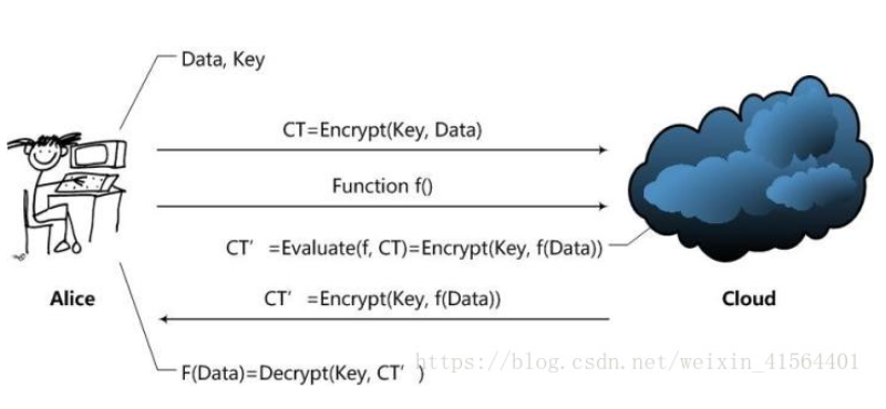 Alice通过Cloud,以Homomorphic Encryption(以下简称HE)处理数据的整个处理过程大致是这样的:
