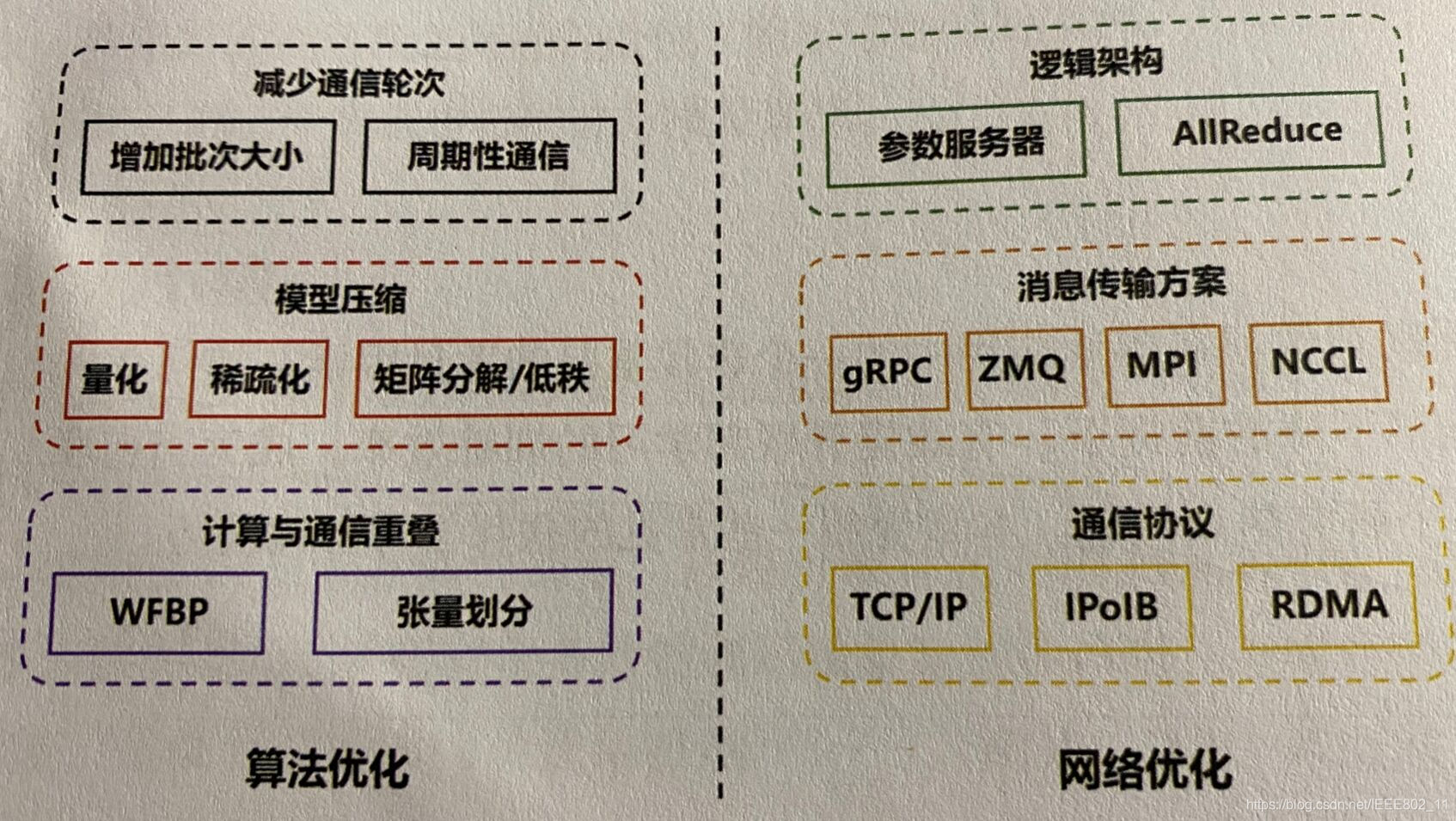 WFBP表示wait-free backpropagation;0ZMQ表示ZeroMQ,NCCL表示NVIDIA collective library。