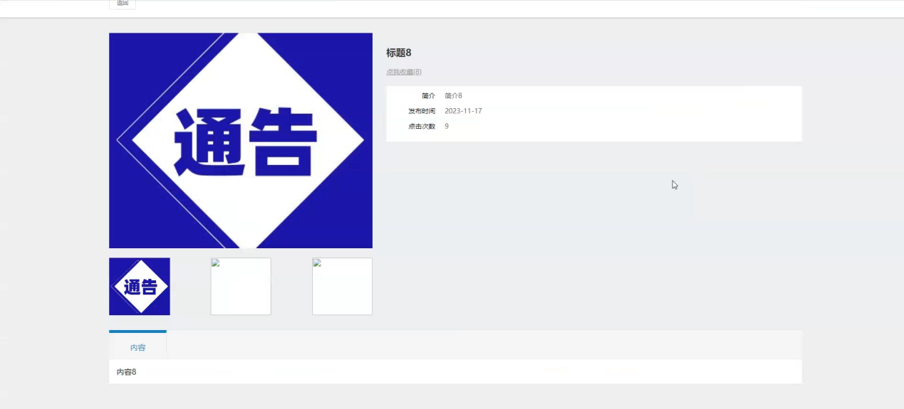 通知公告:在通知公告页面输入美标题、简介进行查询通知公告详细信息,并进行收藏操作;通知公告页面如图5-4所示: