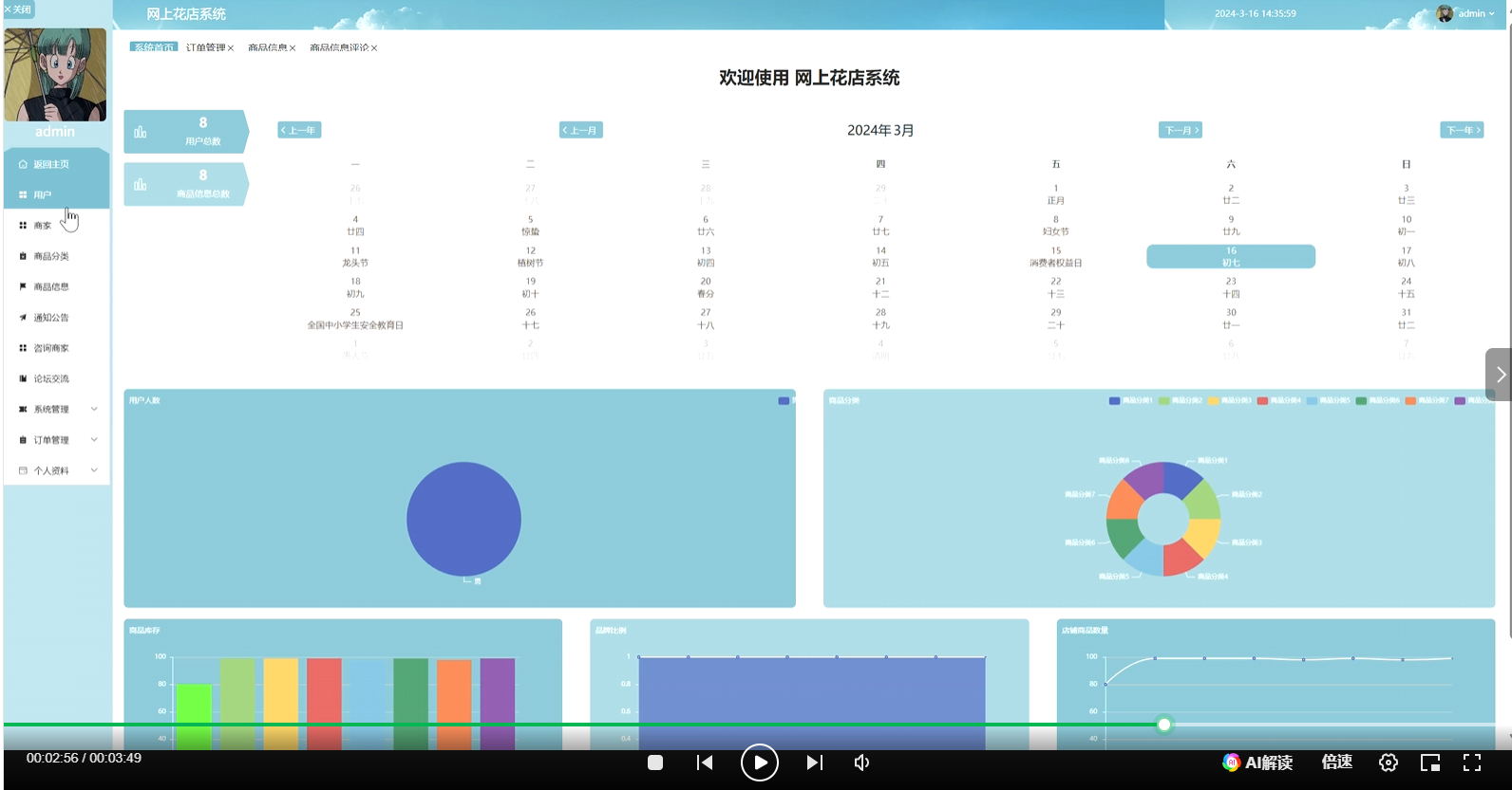 在技术架构上系统采用Java后台语言用于处理Web请求,实现了前后端分离的架构,提高了系统的可拓展性和灵活性。同时MyBatis框架作为数据访问层,MySQL;作为数据存储、综合而言以上网上花店系统通过充分发挥各个框架的优势,实现了对商品信息的灵活管理和订单处理的自动化,为用户提供了一套全面、高效的商品解决方案,助力企业提升市场竞争力和运营效率。以及使系统具有较好的可扩展性和可维护性。