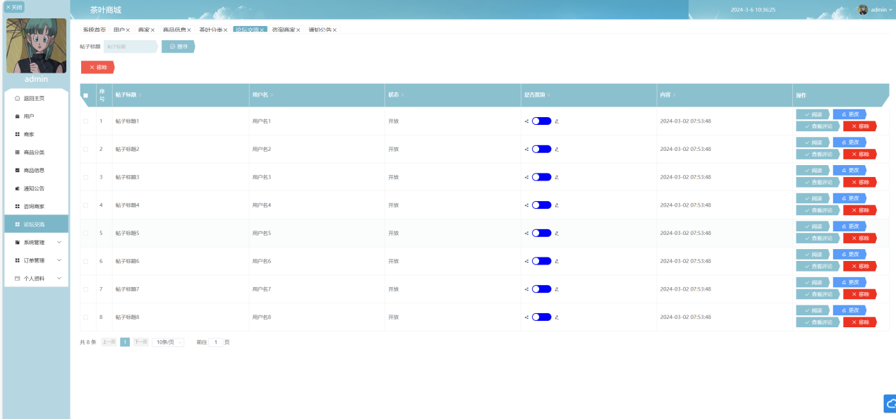 管理员进入主页面,主要功能包括用户、商家、商品分类、商品信息、通知公告、咨询商家、论坛交流、系统管理、订单管理、个人资料等进行操作。管理员主页面如图5-7所示: