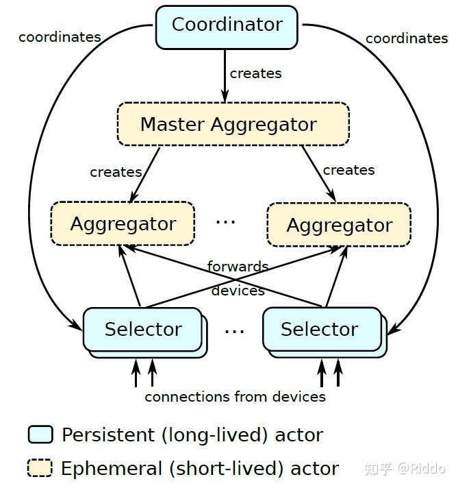 管理每个 FL task 的轮次。为了随着设备数量和更新大小的扩大而扩大,它们做出动态决定,生成一个或多个 Aggregators,将工作委托给这些 Aggregators。