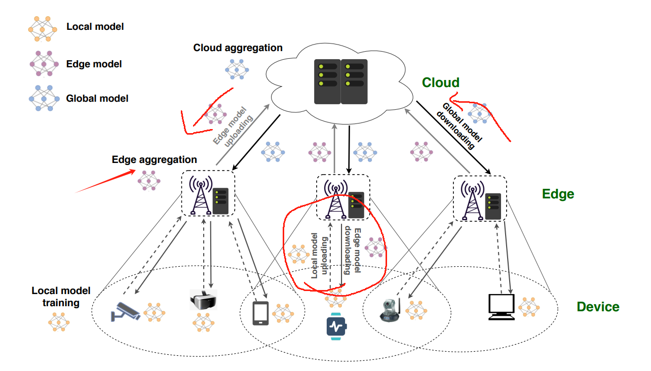 在. S. H. Abad, E. Ozfatura, D. Gündüz, and O. Ercetin, “Hierarchical federated learning across heterogeneous cellular networks,” in Proc. IEEE International Conference on Acoustics, Speech and Signal Processing (ICASSP), Barcelona, Spain, May 2020.中,提出了分层学习,将设备分组为集群,每个集群内的设备借助小基站或集群头进行局部学习,同时在宏基站训练全局模型。该框架在S. Hosseinalipour, S. S. Azam, C. G. Brinton, N. Michelusi, V. Aggarwal, D. J. Love, and H. Dai, “Multi-stage hybrid federated learning over large-scale D2D-enabled fog networks,” arXiv preprint arXiv:2007.09511, 2020.中得到了扩展,该框架为多层学习网络设计了一种训练方法。