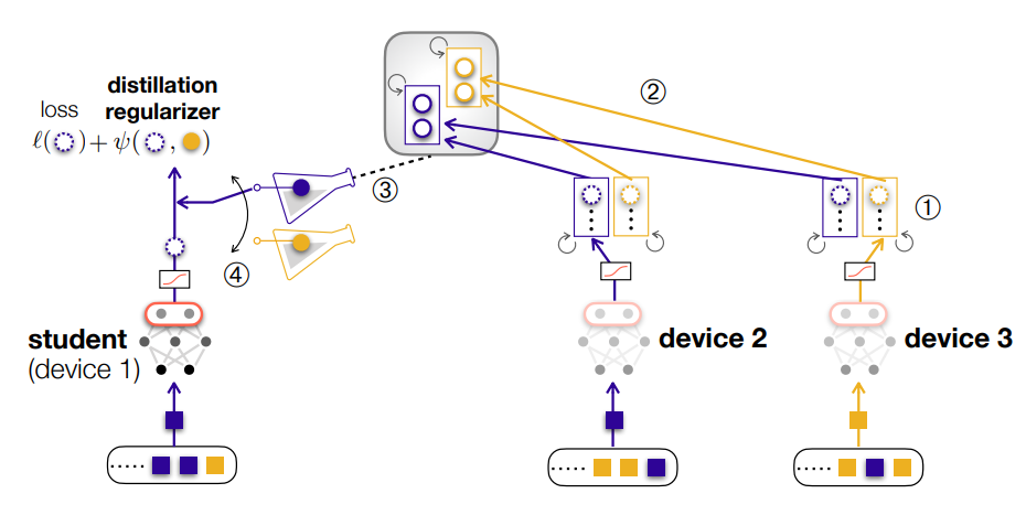 深度神经网络模型参数的数量成本高昂,阻碍了频繁的通信,尤其是在有限的无线资源下。或者,联合蒸馏 (FD) 仅交换维度远小于模型大小的模型输出(例如,MNIST 数据集中的 10 个类)。例如,在分类任务中,每个设备运行本地迭代,同时存储每个类的平均模型输出(即 logit)。然后,定期将这些本地平均输出上传到 PS,聚合和平均每个类设备的本地平均输出。随后,每个设备都会下载生成的全局平均输出。最后,为了将下载的全局知识传输到本地模型中,每个设备都运行具有自己的损失函数的局部迭代,此外还有一个正则化器来测量其自身的训练样本的预测输出与给定样本类别的全局平均输出之间的差距。这种正则化方法称为知识蒸馏(KD)。
