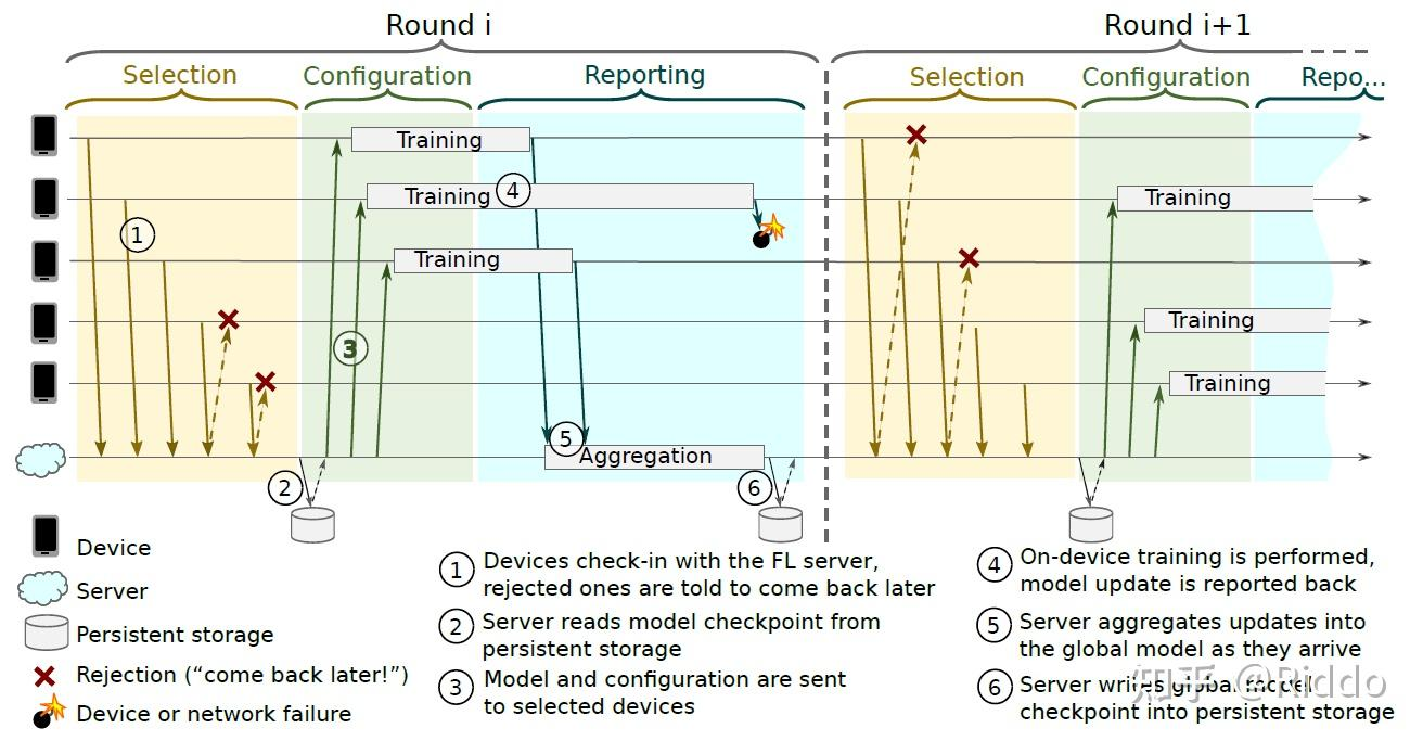 每过一定的间隔时间,满足要求(比如正在充电并连着 WiFi 的手机)的设备就会向服务器注册。服务器就会通过水塘抽样(reservoir sampling)”选择已连接设备的子集来参与这一轮的训练。服务器会向没有选中的设备发送下一次间隔后重连的指令。