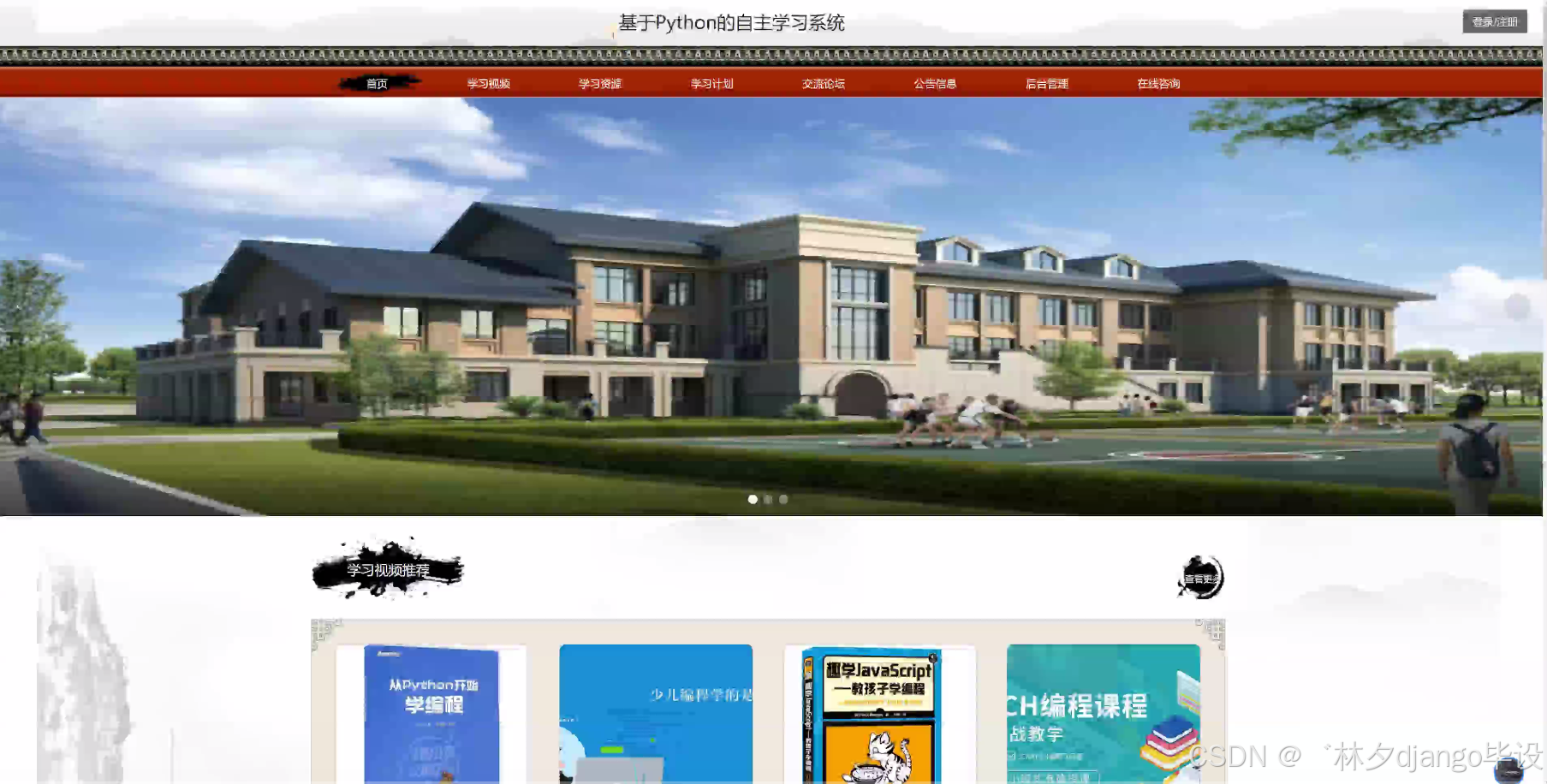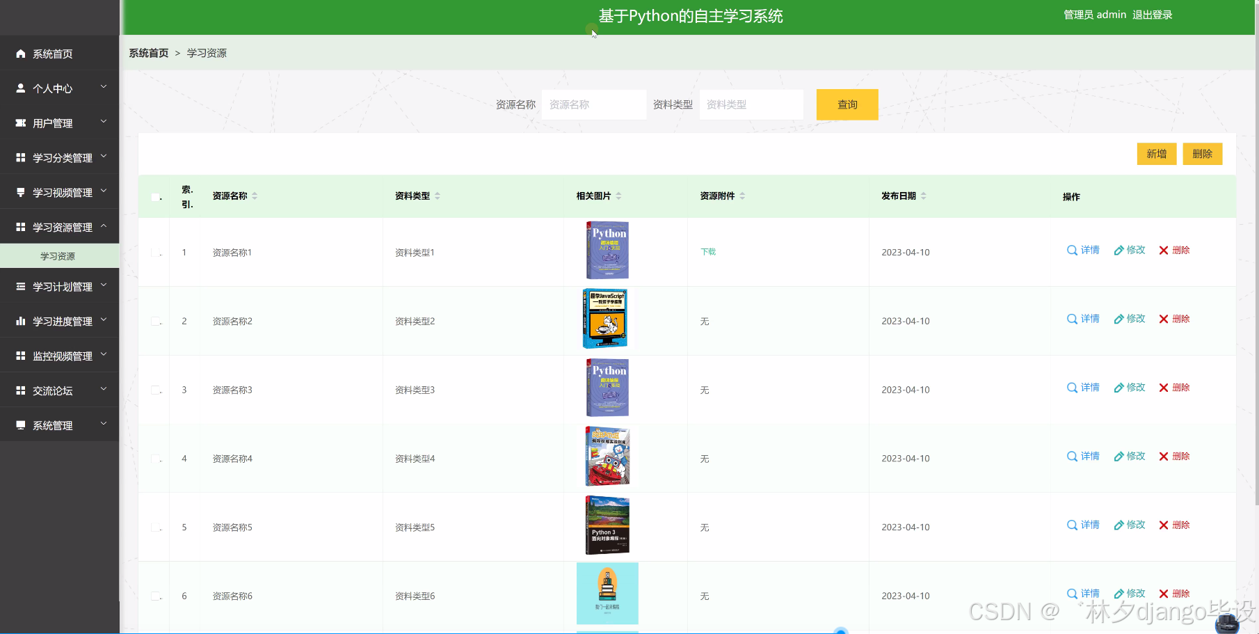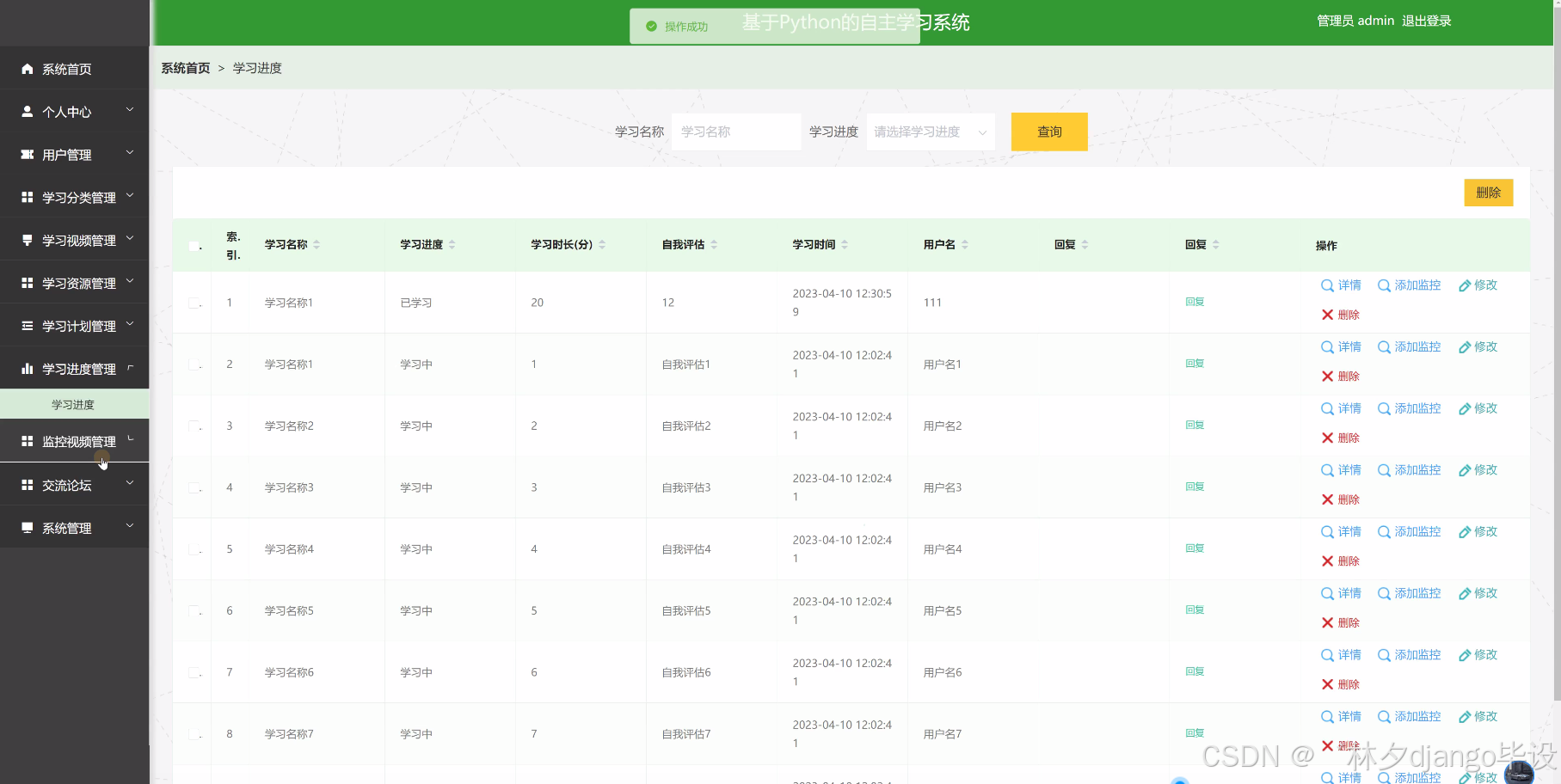 - 系统功能的完整实现:成功构建django+vue自主学习系统,实现用户、学习分类、学习视频、学习资源、学习计划、学习进度、监控视频等系统功能的正常运行,且各功能模块之间交互流畅、数据处理准确。