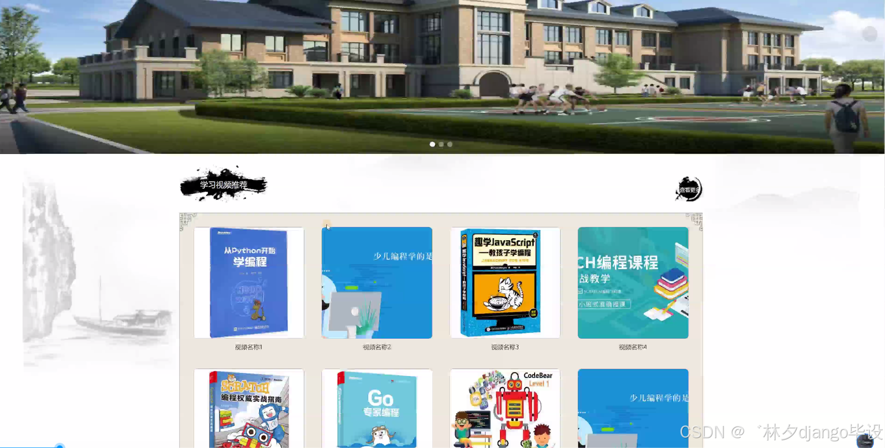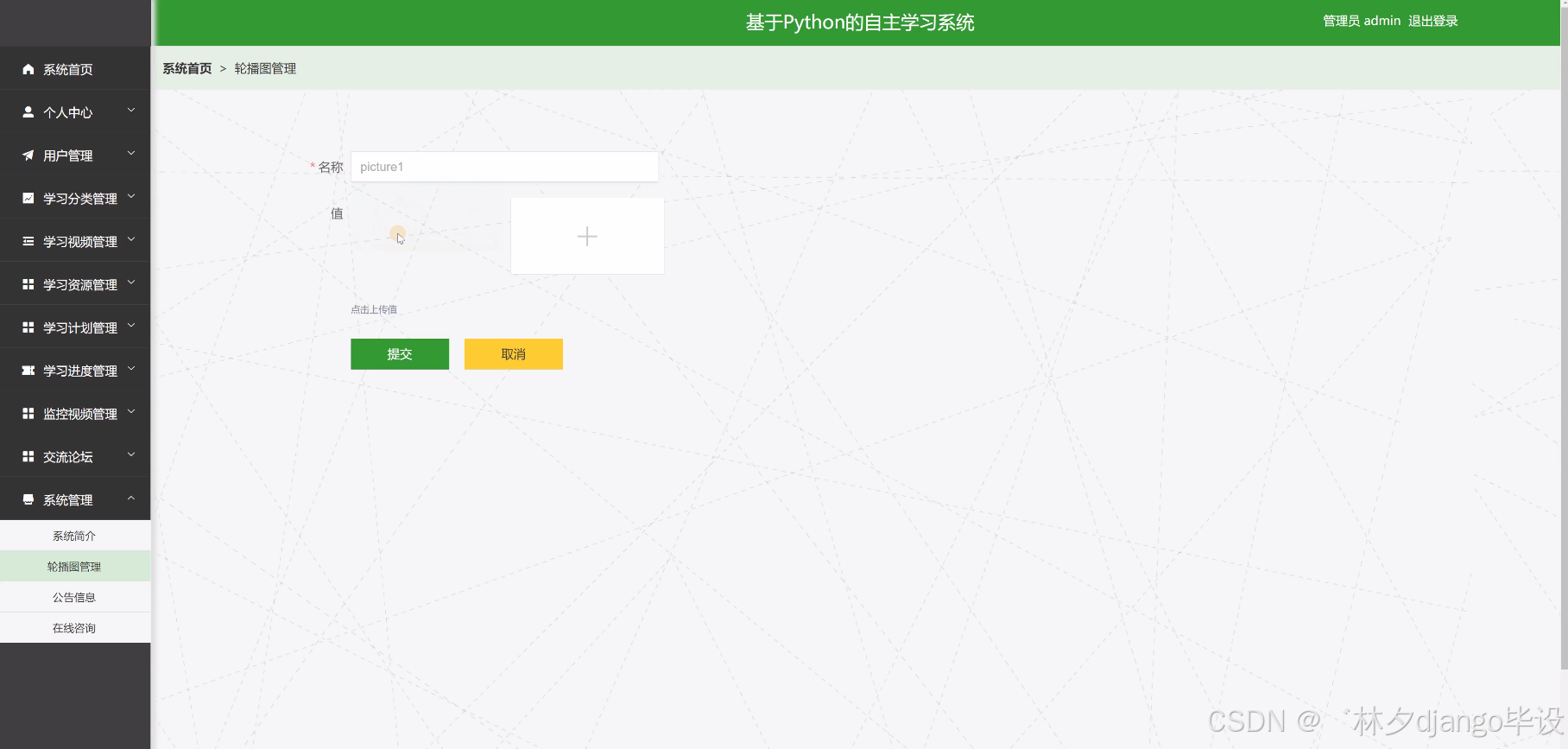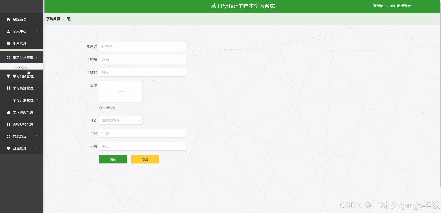 - 系统功能的完整实现:成功构建django+vue自主学习系统,实现用户、学习分类、学习视频、学习资源、学习计划、学习进度、监控视频等系统功能的正常运行,且各功能模块之间交互流畅、数据处理准确。