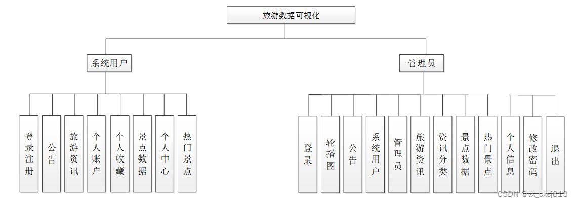 旅游数据可视化整体的功能模块包括管理员这个模块,实现了对景点数据相关信息的查询管理,系统功能模块如图所示。