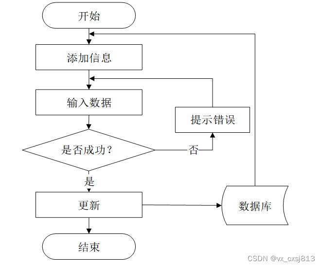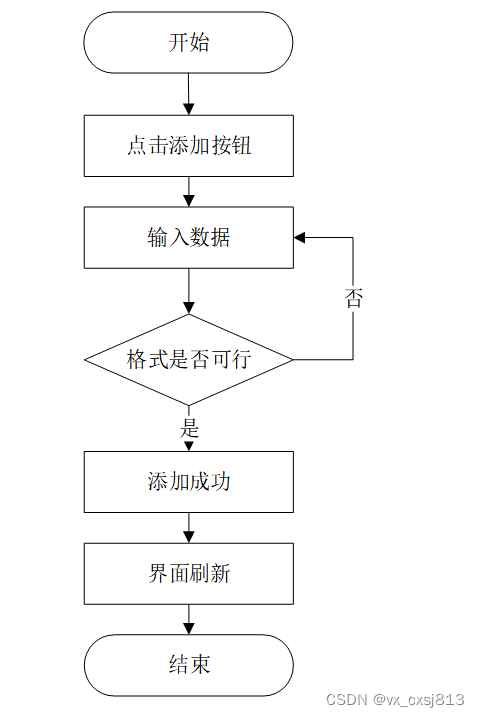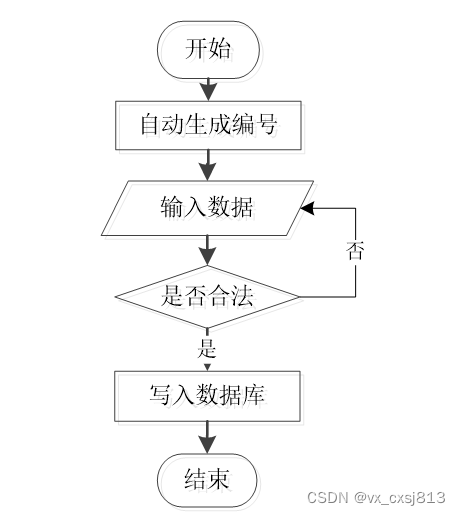 用户成功登入系统后就能够实现增加数据的操作,增加数据的编号是特定的,系统生成,用户不能随意填写,除了编号以外,其他增加信息用户自己填写,填写后的信息经过系统验证,验证合法通过就显示增加数据成功了,相反的话,就没有增加成功,图2-1显示的就是在增加数据时的流程。