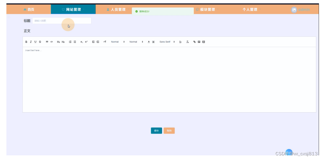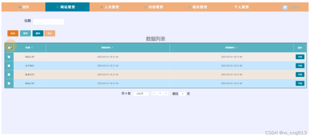 (1)网站管理:管理员可以对系统前台展示的轮播图以及公告进行增删改查,方便用户进行查看。