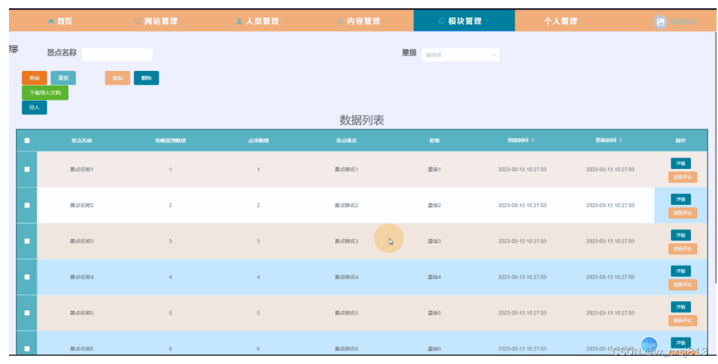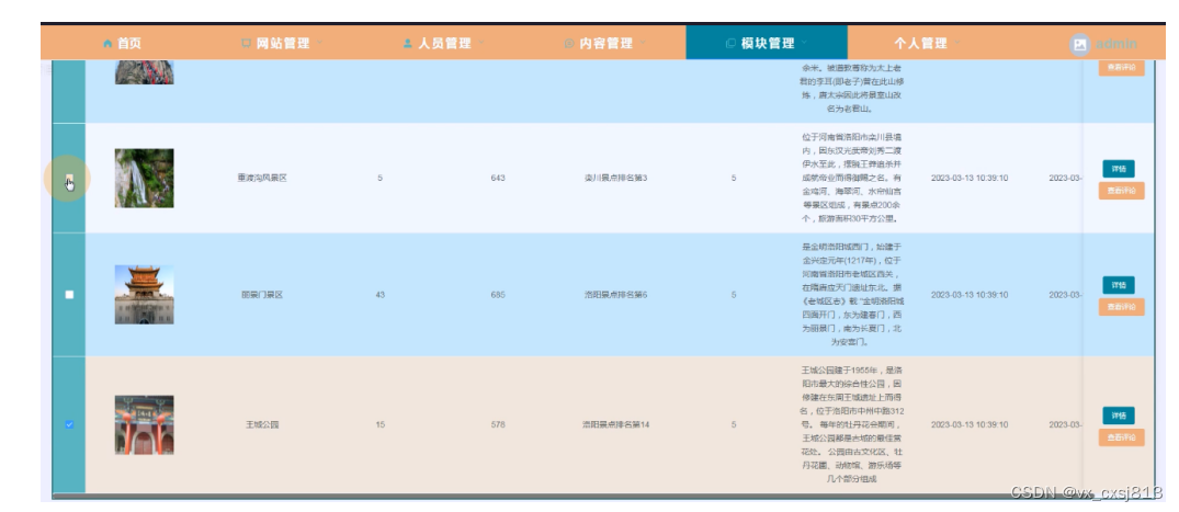 (4)模块管理:在“模块管理”这一菜单下可以对系统当中的系统用户操作的所有信息进行管理,包含了景点数据、热门景点。