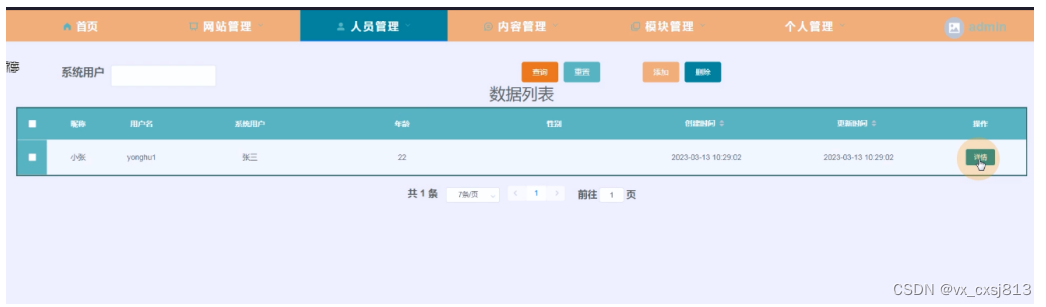 (2)人员管理:管理员可以对旅游数据可视化中的管理员以及前台注册的系统用户进行审核管理。