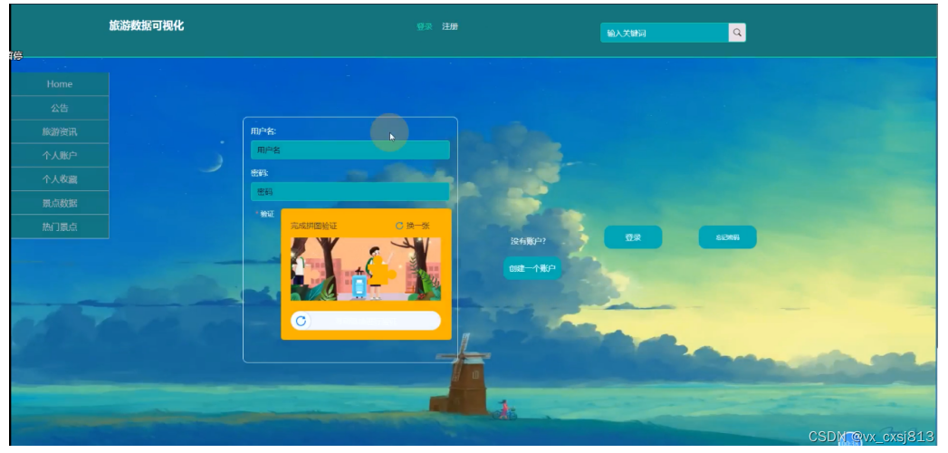 (2)查看旅游数据可视化的首页信息:旅游数据可视化的首页信息包含了首页、公告、旅游资讯、个人账户、个人收藏、景点数据、热门景点。
