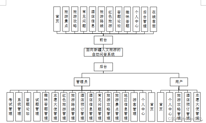 后台主要是管理员,管理员功能包括首页,个人中心,游客管理,地区信息管理,旅游景点管理,旅游攻略管理,常见问题管理,酒店信息管理,酒店预订管理,旅游线路管理,红色旅游管理,志愿大使管理,趣味答题管理,试题管理,答题论坛,系统管理,考试管理等;