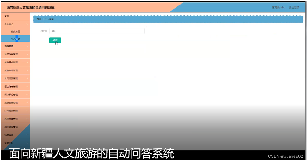管理员登录系统后,可以对首页,个人中心,游客管理,地区信息管理,旅游景点管理,旅游攻略管理,常见问题管理,酒店信息管理,酒店预订管理,旅游线路管理,红色旅游管理,志愿大使管理,趣味答题管理,试题管理,答题论坛,系统管理,考试管理等功能进行相应的操作管理,如图4-9所示。
