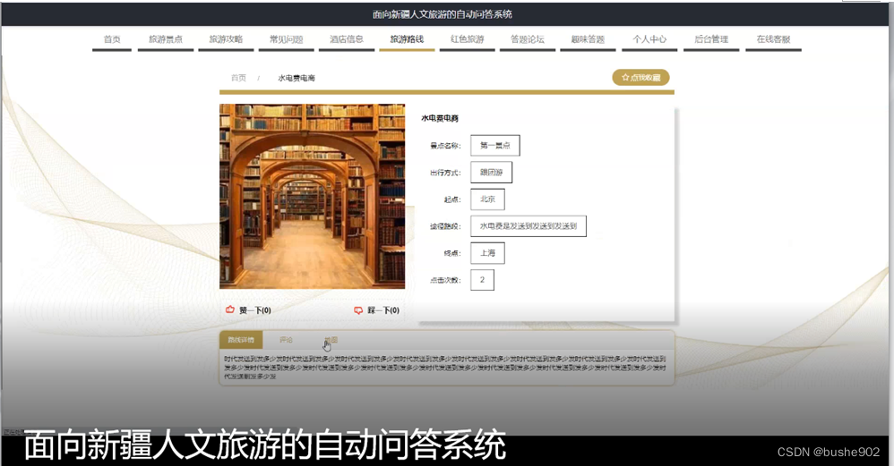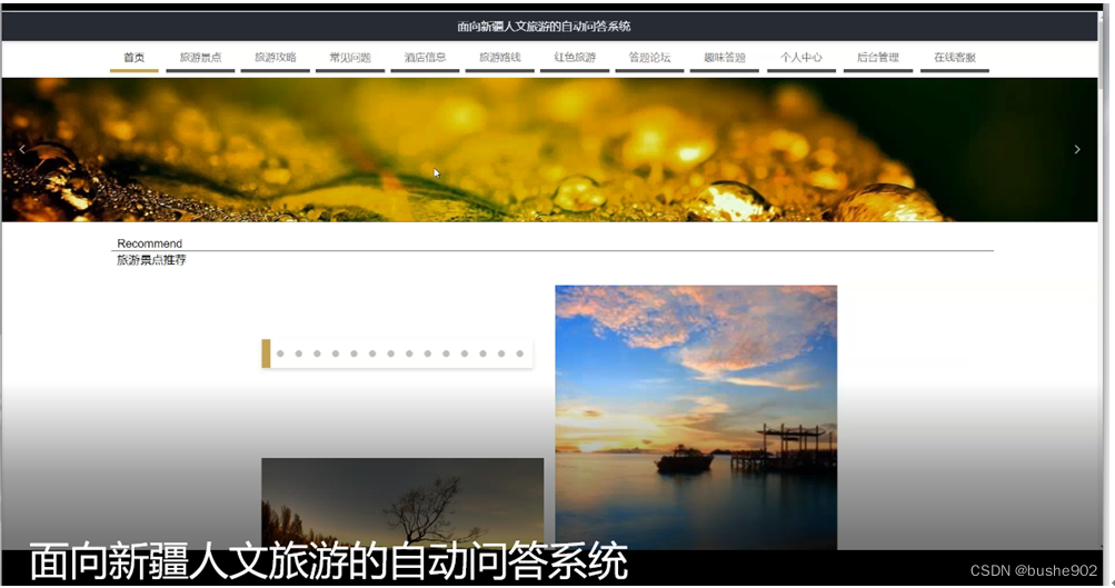 面向新疆人文旅游的自动问答系统,在系统首页可以查看首页,旅游景点,旅游攻略,常见问题,酒店信息,旅游线路,红色旅游,答题论坛,趣味答题,个人中心,后台管理,在线客服等内容,并进行详细操作;如图4-1所示。