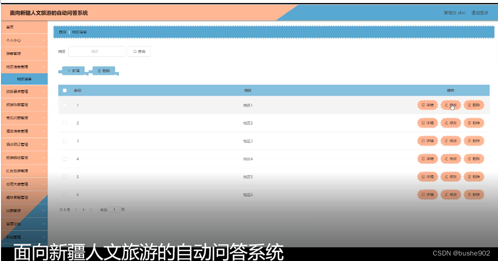 地区信息管理,在地区信息界面可以对索引,地区等内容进行详情,修改和删除操作,如图4-11所示。