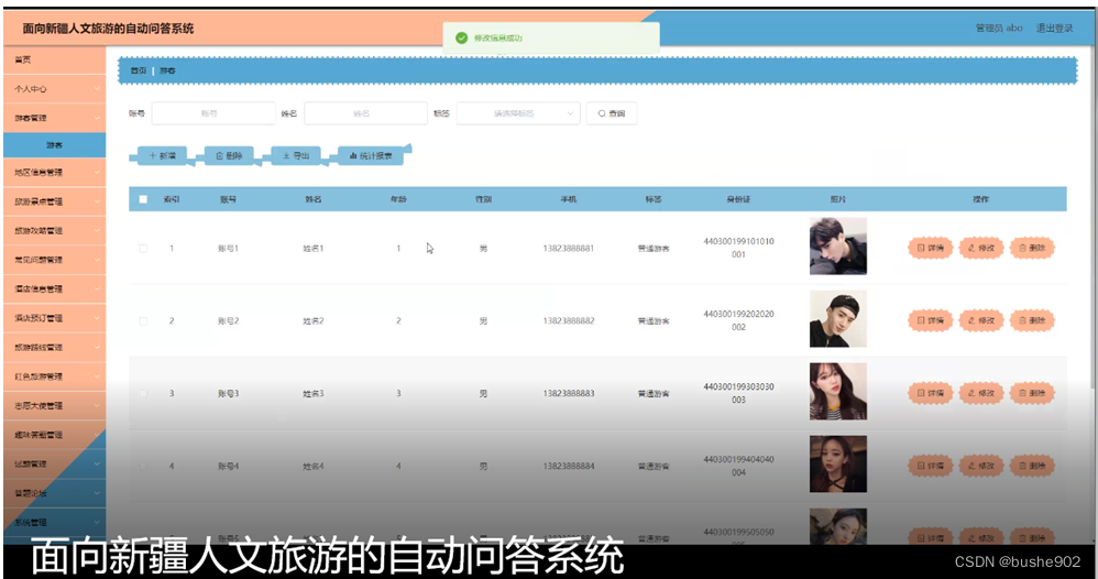 游客管理,在游客界面可以对索引,账号,姓名,年龄,性别,手机,标签,身份证,照片等内容进行详情,修改和删除等操作,如图4-10所示。