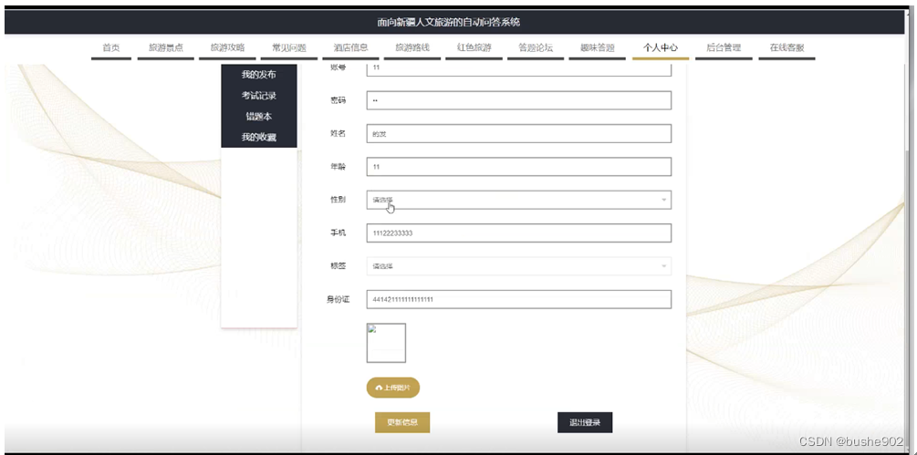 个人中心,在个人中心页面通过填写账号,密码,姓名,年龄,性别,手机,标签,身份证,照片等内容进行更新信息,还可以根据需要对我的发布,考试记录,错题本,我的收藏等进行相对应操作,如图4-4所示。