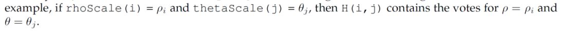 H是Hough变换累加器;RhoRes和taRes是累加器分辨率参数,nLine是返回的行数。Output lineRho和lineTheta都是nline x 1向量,它们分别包含图像中所找到的线条的参数(p和θ)。