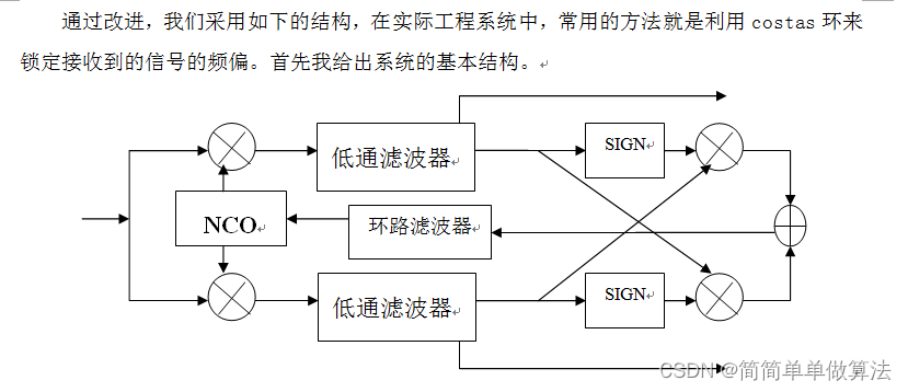 基于Costas环的载波同步系统是一种有效的方式,用于恢复接收信号的载波频率和相位,以便正确解调信号并提取数据。这种系统在数字通信系统中非常常见,特别是在调制解调器和同步接收机中。