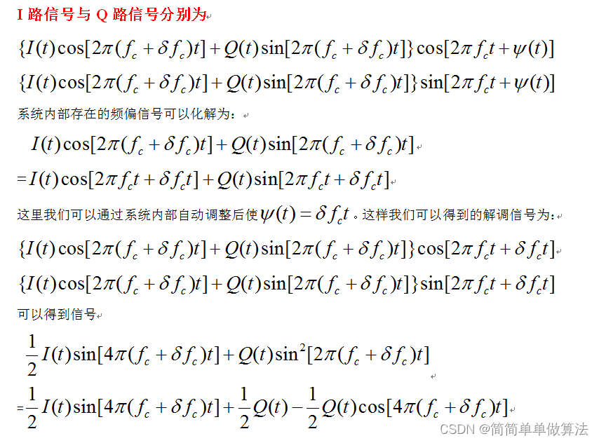 Costas环路: Costas环路包括两个分支,一个用于估计频率,另一个用于估计相位。这两个分支分别用于控制本地振荡器的频率和相位。其基本公式如下: