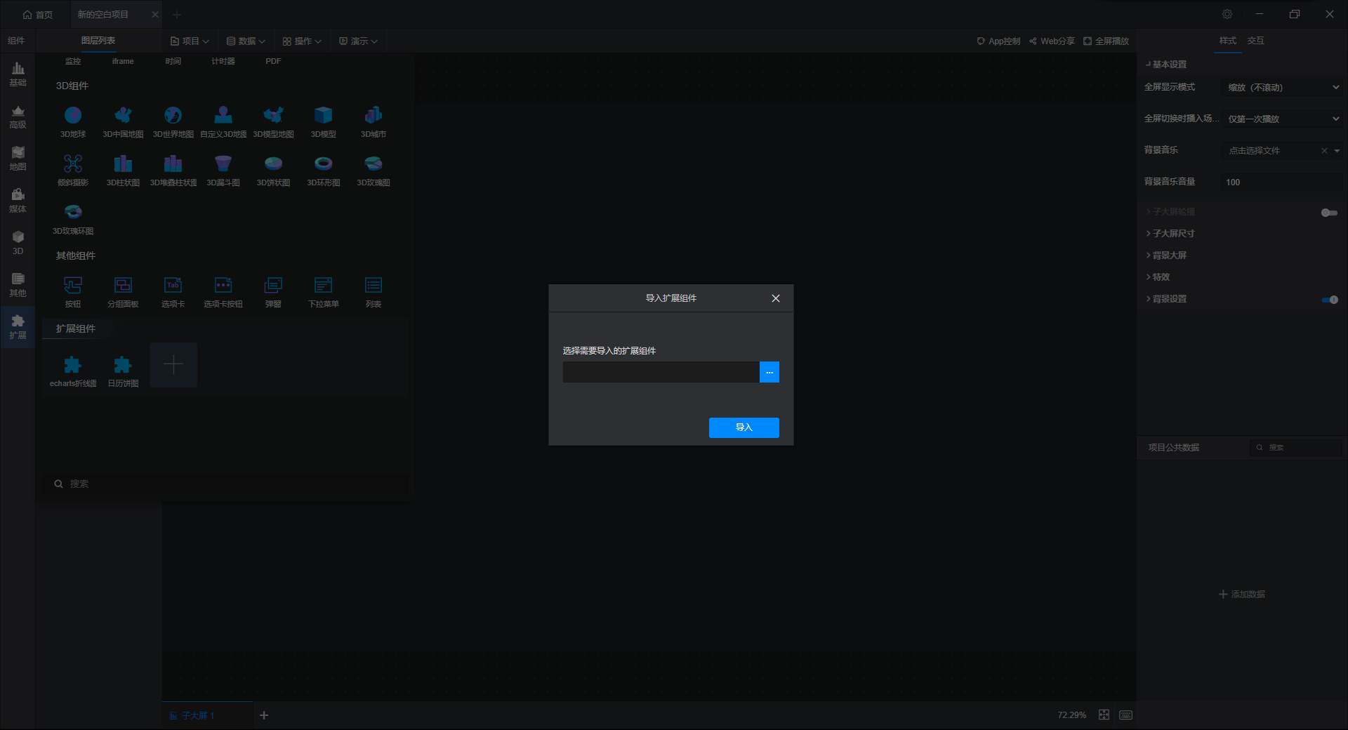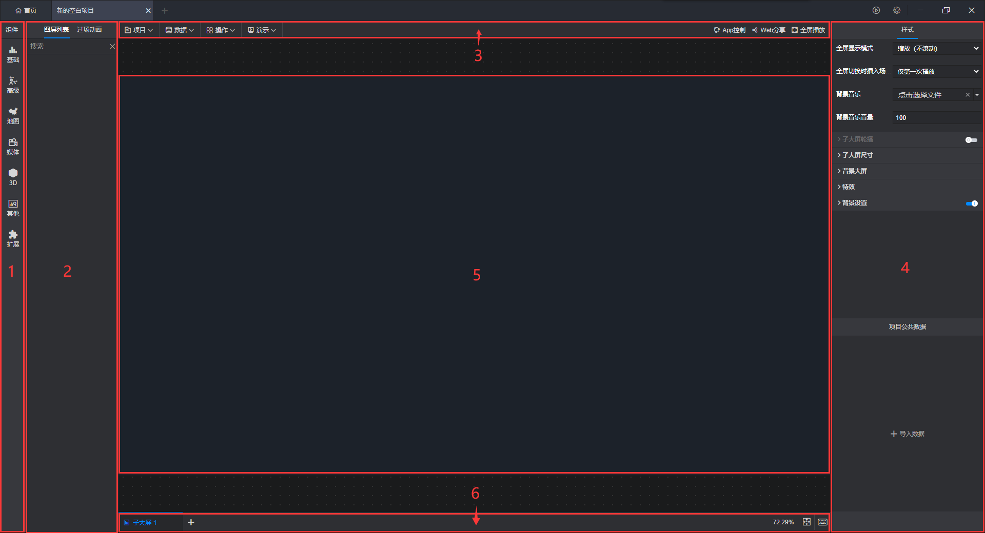 2.图层列表和过场动画:每个组件或每个自定义动画对应一个图层列表,图层列表从上到下的顺序就是组件在大屏中的上下摆放层次,动画按照设置顺序播放 3、菜单:包括项目、数据、操作、演示、App 控制、Web 分享和全屏播放。