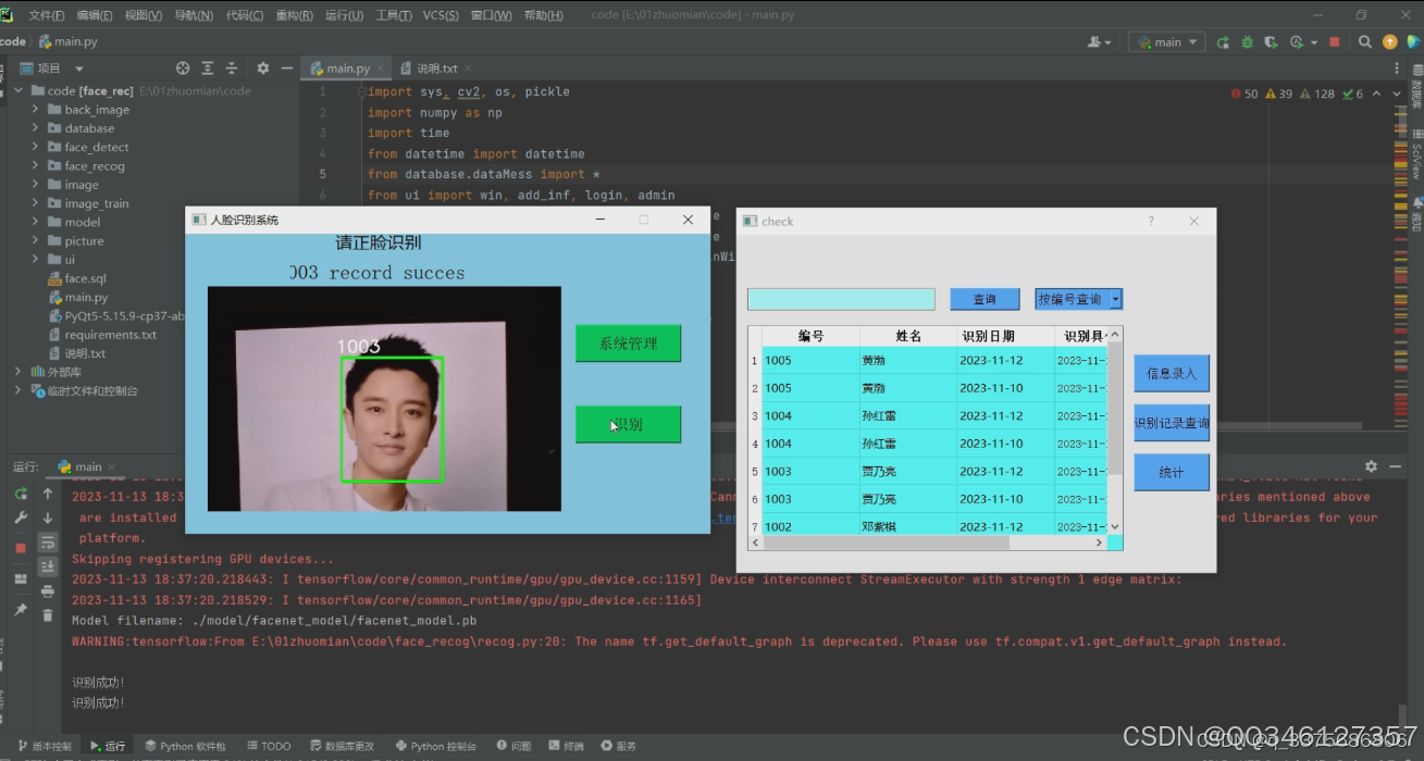 技术栈:Python语言、facenet人脸识别算法 Tensorflow MySQL数据库,可实现人脸的录入,人脸识别,识别记录查询,基于Tensorflow和mysql数据库实现的人脸识别系统Python语言提供了丰富的图像处理和机器学习库,如OpenCV、dlib、Tensorflow等,这些库可以辅助实现人脸检测、对齐、特征提取等功能;而facenet是一种基于深度学习的人脸识别算法,可以