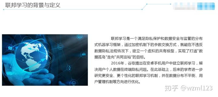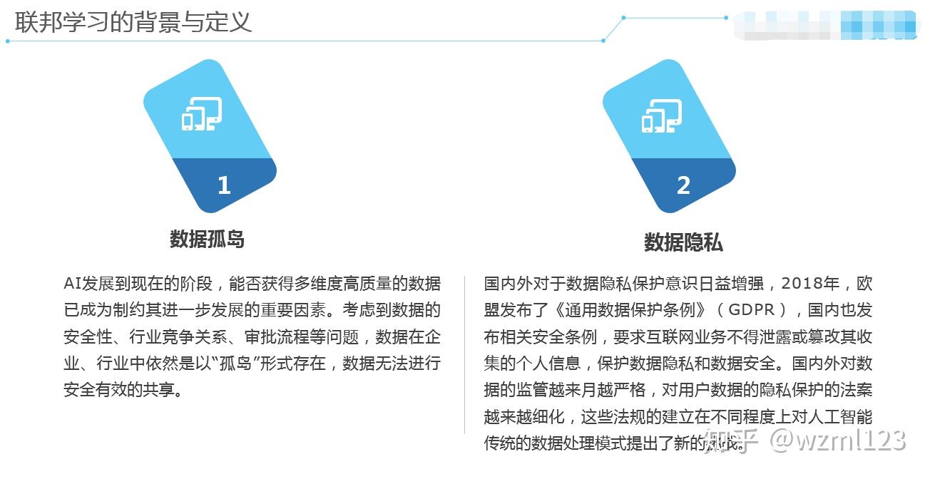1、联邦学习的背景与定义联邦学习(Federated Learning,FL)也称为联盟学习,一个新兴的人工智能技术,最初由谷歌在2016年提出,用以解决个人数据在安卓手机端的隐私问题。在国内,微众银行的首席人工智能官、香港科技大学教授杨强针对金融风控领域,对联邦学习进行了相关技术的开发和应用。在当下的人工智能时代,不能说各个领域相关的应用算法已经发展成熟,但也至少在稳步推进,但技术的底层依然是数