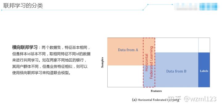 在数据集共享相同特征空间但样本不同的情况下引入了横向联邦学习或基于样本的联邦学习。例如,两个区域银行可能具有与其各自区域不同的用户组,并且它们的用户的交集非常小。但是,它们的业务非常相似,因此要素空间相同。
