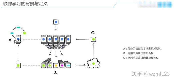 以下以展示了谷歌基于用户安卓手机端进行的联邦学习过程,各个用户使用手机训练自己的本地模型,并将模型相关参数回传给一个聚合中心节点,聚合中心节点聚合各方参数后,得到一个共享模型,将共享模型发送给各个用户手机,用户手机再基于自身的数据进行模型训练。如此反复,直至收敛。